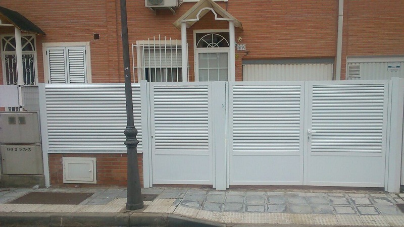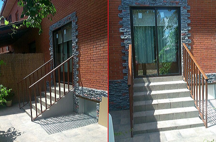 Barandillas en Aluminio color madera (embero) y contrapuerta corredera (bronce).