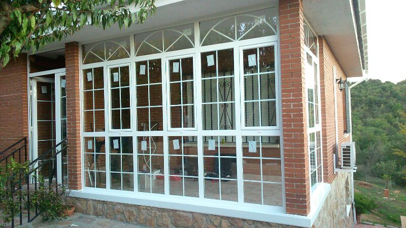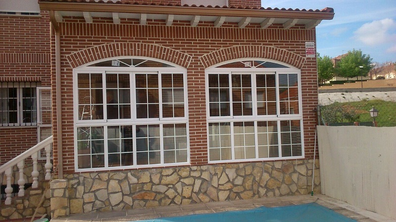 Cerramiento de porche en aluminio lacado blanco con arcos de medio punto.