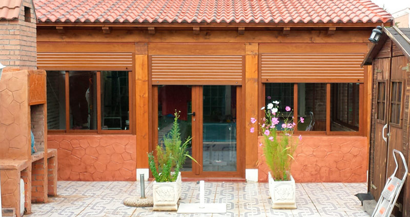 Cerramiento de porche en Azuqueca de Henares en aluminio imitación a madera, color embero.